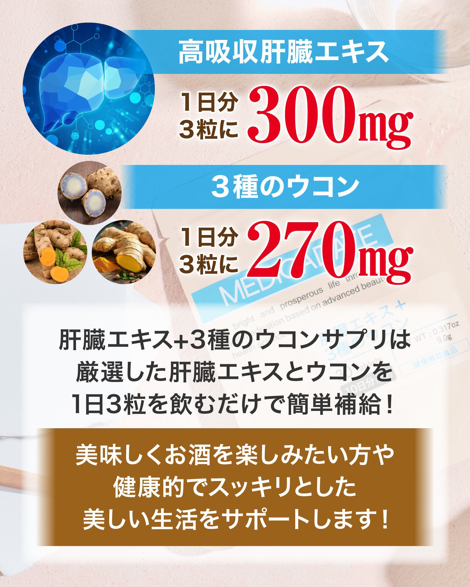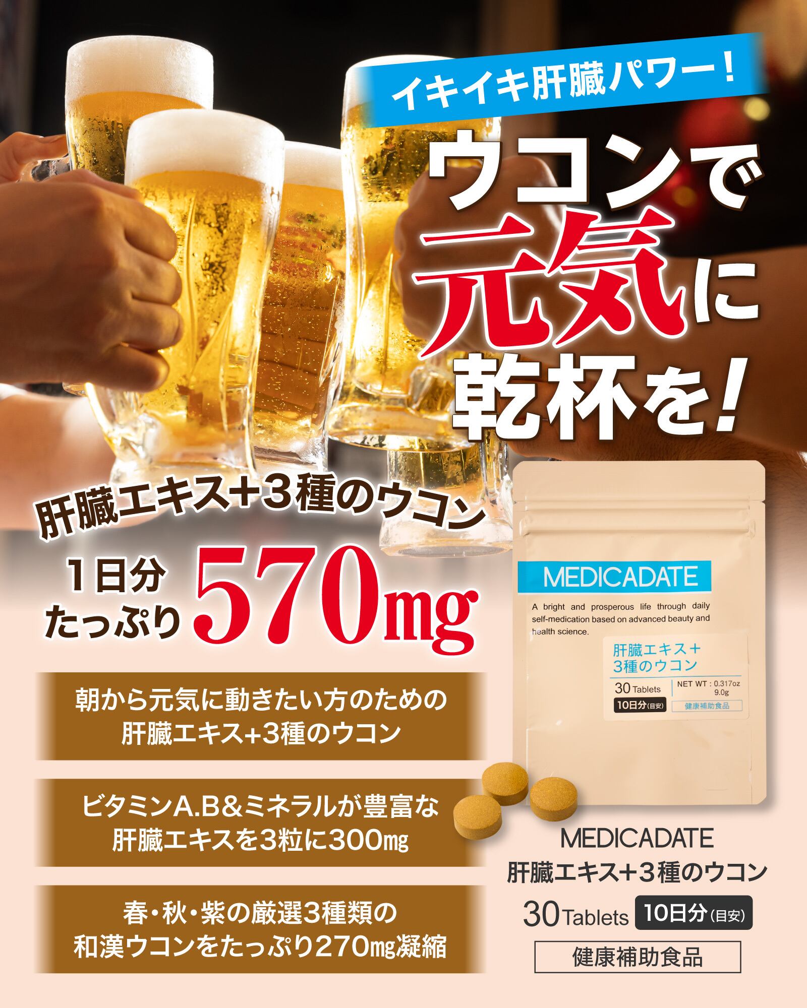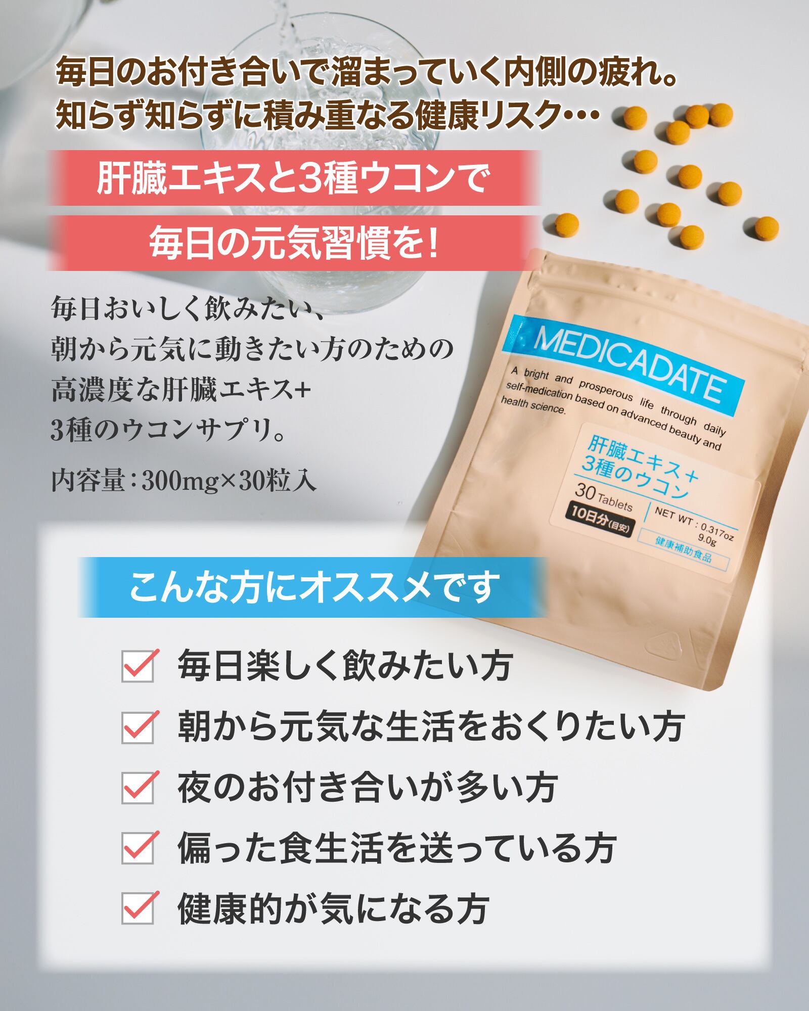 MEDICADATEの肝臓エキス+ウコンサプリは、たった1日の目安量3粒に肝臓エキス300mgと、3種類の和漢ウコン270mgを凝縮。肝臓エキスやウコンに含まれるビタミンやクルクミン、ポリフェノールが健やかな生活をサポート。毎日のリズムを整えたい方の栄養補給におすすめのサプリメントです。
