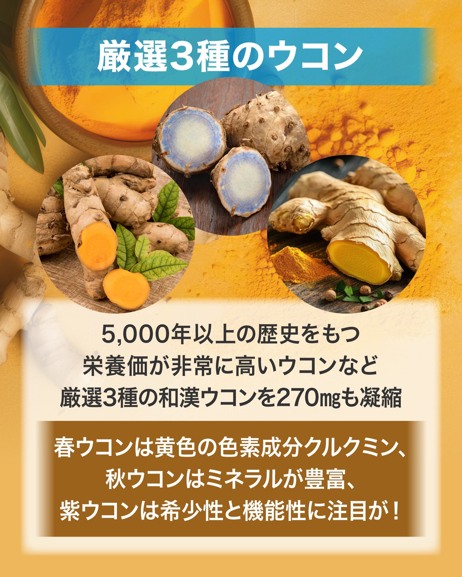 - 5,000年以上の歴史をもつ和漢素材「秋ウコン」など3種のウコンを1粒に凝縮。